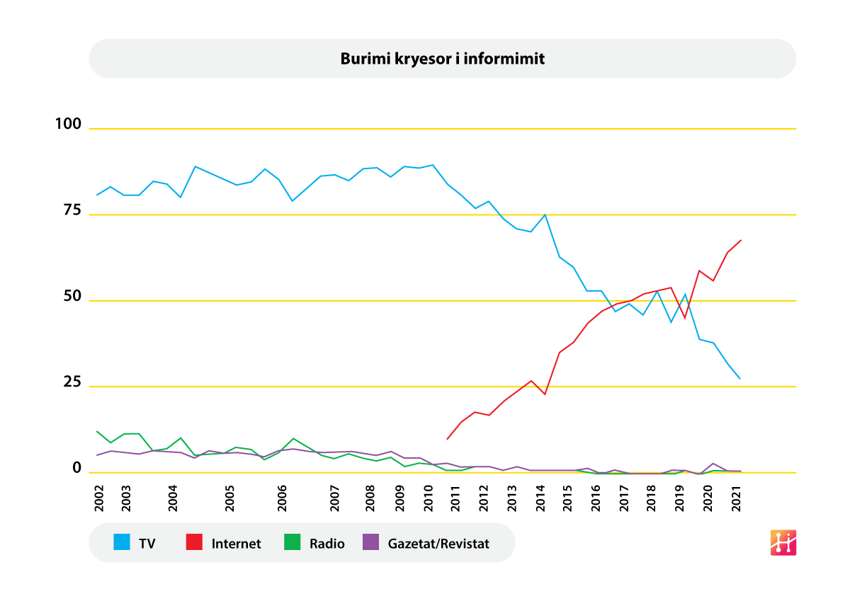 Ky graf tregon përparësinë që interneti ka si burim informues në vendin tonë. Pas tij, vjen televizioni edhepse me një diferencë të dukshme, e krejt pak konsiderohen edhe radio, gazetat e revistat.